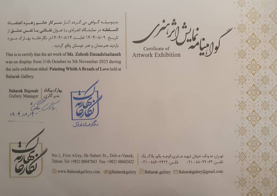 آلبوم تصاویر نمایشگاه انفرادی «نقاشی با نفس عشق» زهره اعتضادالسلطنه در گالری بهارک (۱۴۰۴)
